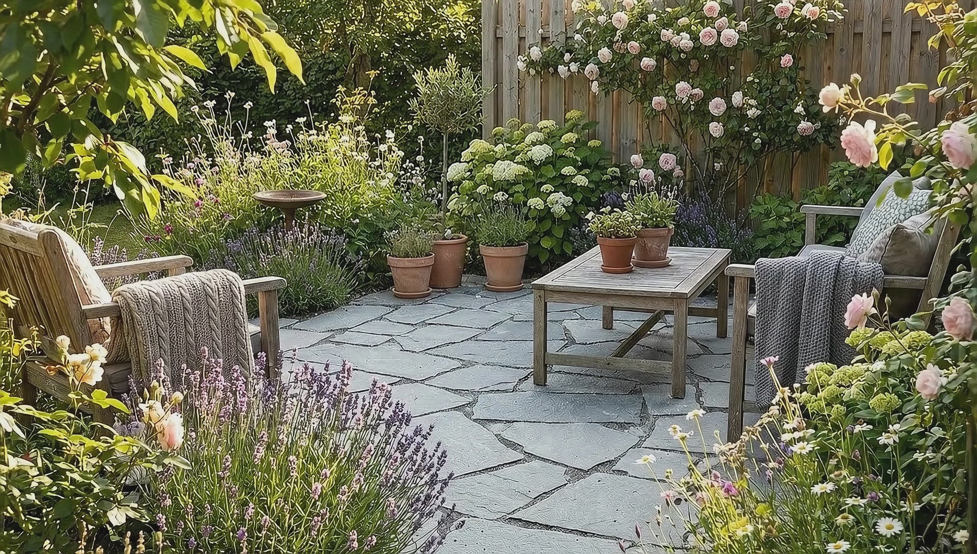 Skal stien mellem køkkenhave og orangeri være knapt så formel, skaber skiferbrud i store, uregelmæssige former et organisk flow. De flade plader hviler direkte i græsset eller i et tyndt lag afretningssand, og fordi linjerne ikke er rette, virker ruten naturlig som en skovsti. Omvendt vælger mange mahognifarvede sandstensbrud til områder med terracotta-krukker og salviebed, hvor de gyldne nuancer fanger eftermiddagslyset.