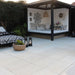 Den lyse sandfarve står utrolig flot sammen med mørke elementer. Et populært designtip er at lægge en bort af mørke sten eller afslutte belægningen mod et bed med sorte granitskærver. Dette fremhæver flisens varme glød og giver en skarp, arkitektonisk finish.