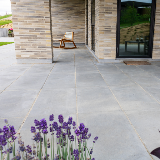 Massiv storformatflise til indkørsel og terrasse. Disse 90x90 cm soldaterfliser i 8 cm tykkelse kombinerer et minimalistisk udtryk med ekstrem sty...